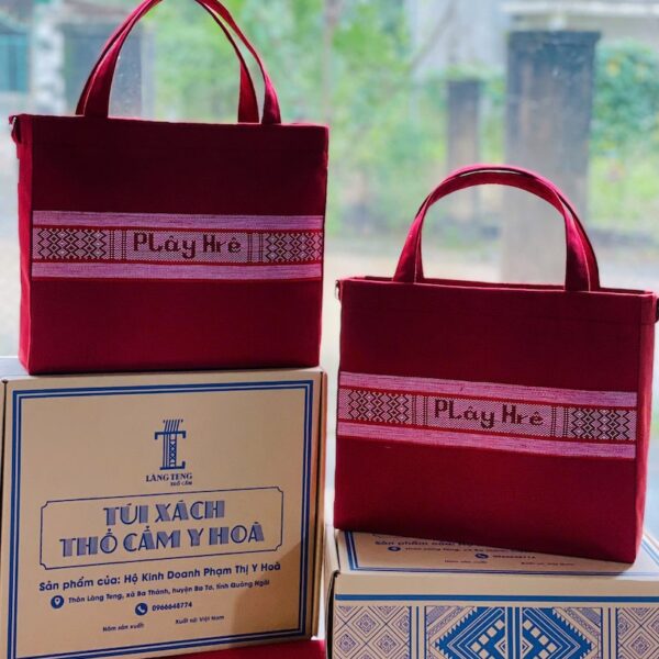 Túi xách cầm tay, túi đeo vai, balo thổ cẩm hoa văn dệt cài với đường may tinh tế, cẩn thận. Sản phẩm còn được cá nhân hóa thông qua việc dệt cài trực tiếp tên khách hàng trên nền vải theo yêu cầu.